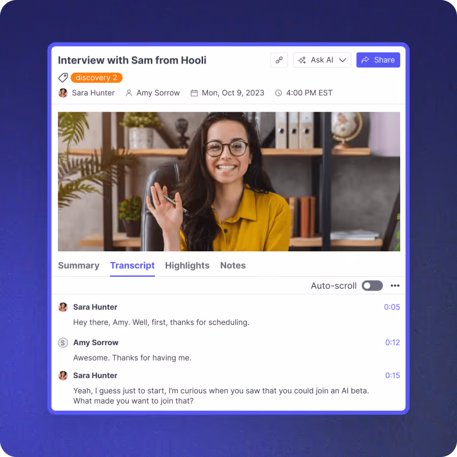“With Ask AI, we can now get an initial analysis of hours of interviews in minutes. This feature helps our teams move faster when understanding user needs and problems.”