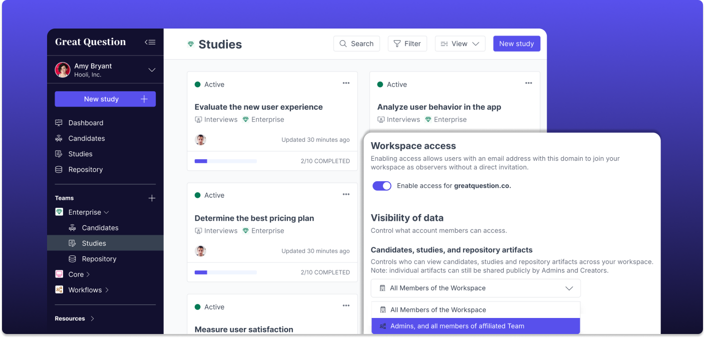 Need fully siloed teams for sensitive research? Done. Want an open culture with guardrails, where most research is visible but HR studies stay private and each team manages its own budget? That works too.