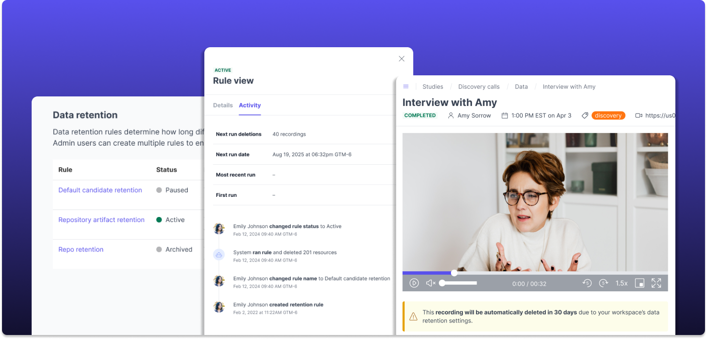 The new rules engine lets you create named retention policies with flexible timeframes: days, weeks, months, or years. Set rules for candidates, recordings, or both. Build rules in draft mode so your privacy team can review the full configuration before anything goes live. When you're ready, activate the rule and let the system handle the rest. A 30-day lookahead gives stakeholders time to review what's scheduled for deletion before anything is permanently removed. Every action is logged in a full activity trail for compliance audits.