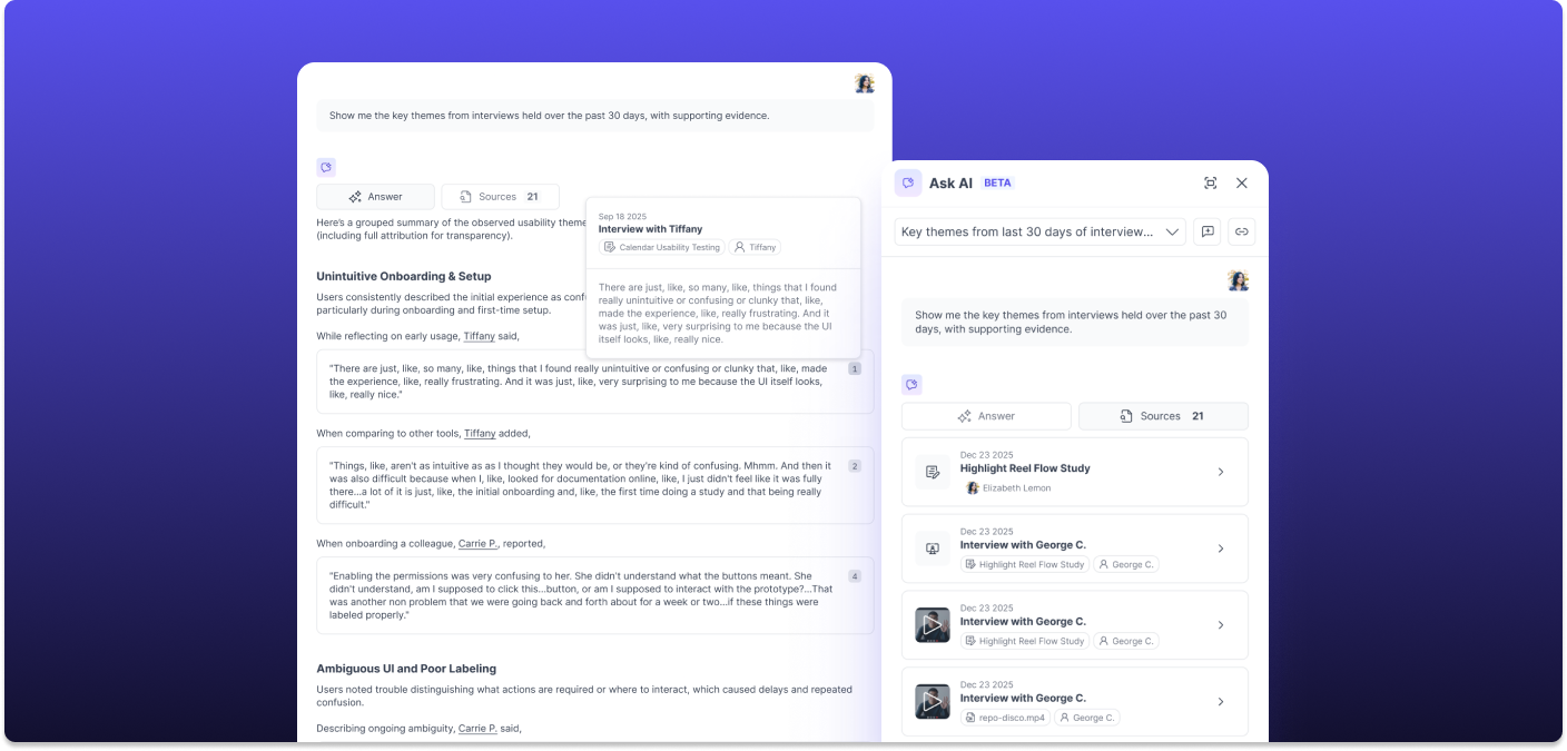 Since opening the beta, user feedback has driven every improvement: multi-select filtering to scope questions to specific teams or studies, inline citations inside synthesized summaries, an end-to-end citation experience with a floating video player for source verification, and the ability to create highlights and tags directly from AI chat responses.