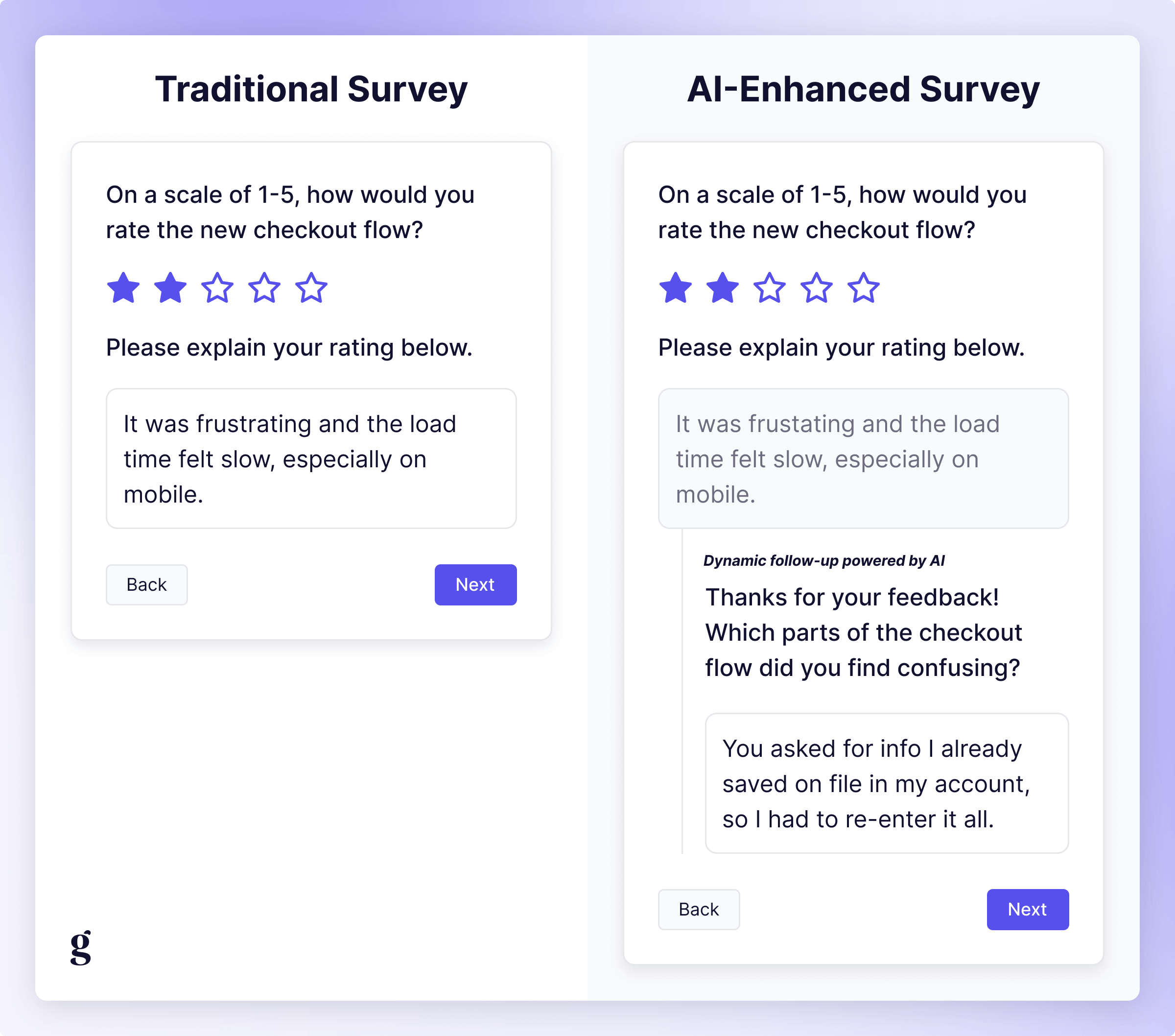 This extends to vague or short answers as well. If someone writes "it's fine" in response to an open-ended question, the survey can prompt them: "Could you tell me a bit more about what 'fine' means to you in this context?" It's addressing one of the biggest weaknesses in surveying: the lack of depth and richness we struggle with when analyzing responses later.